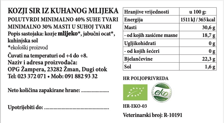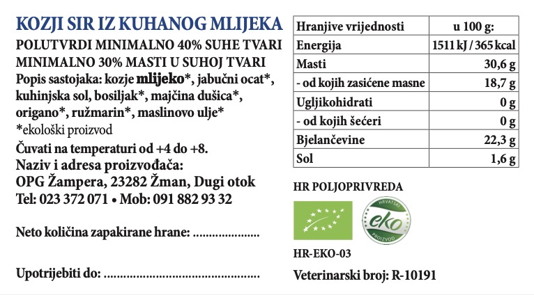 Dobiven od ekološkog kuhanog kozjeg mlijeka s dodatkom jabučnog octa, bosiljka, origana, ružmarina i majčine dušice. Odličan izbor kao dodatak u salatama ili platama.
